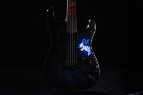 ピックガードにデザインされたゴジラの背びれが青白く発光🌟歪みが増すほど光量も増加!