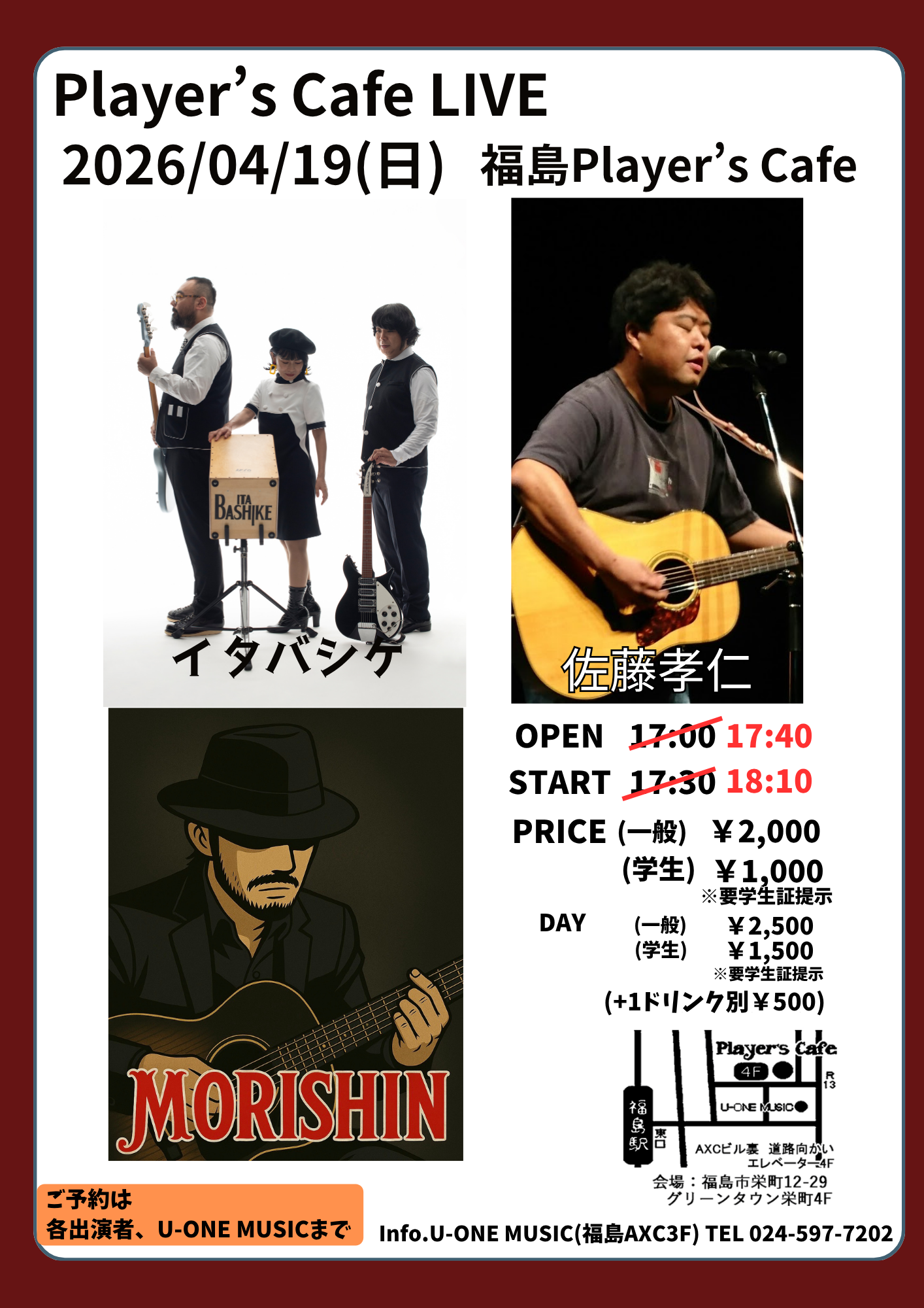 ※こちらの事情でOPEN、START時間を変更させていただきます。急な変更となりご迷惑をおかけいたします。ご確認の上、ご来場お願い致します。
